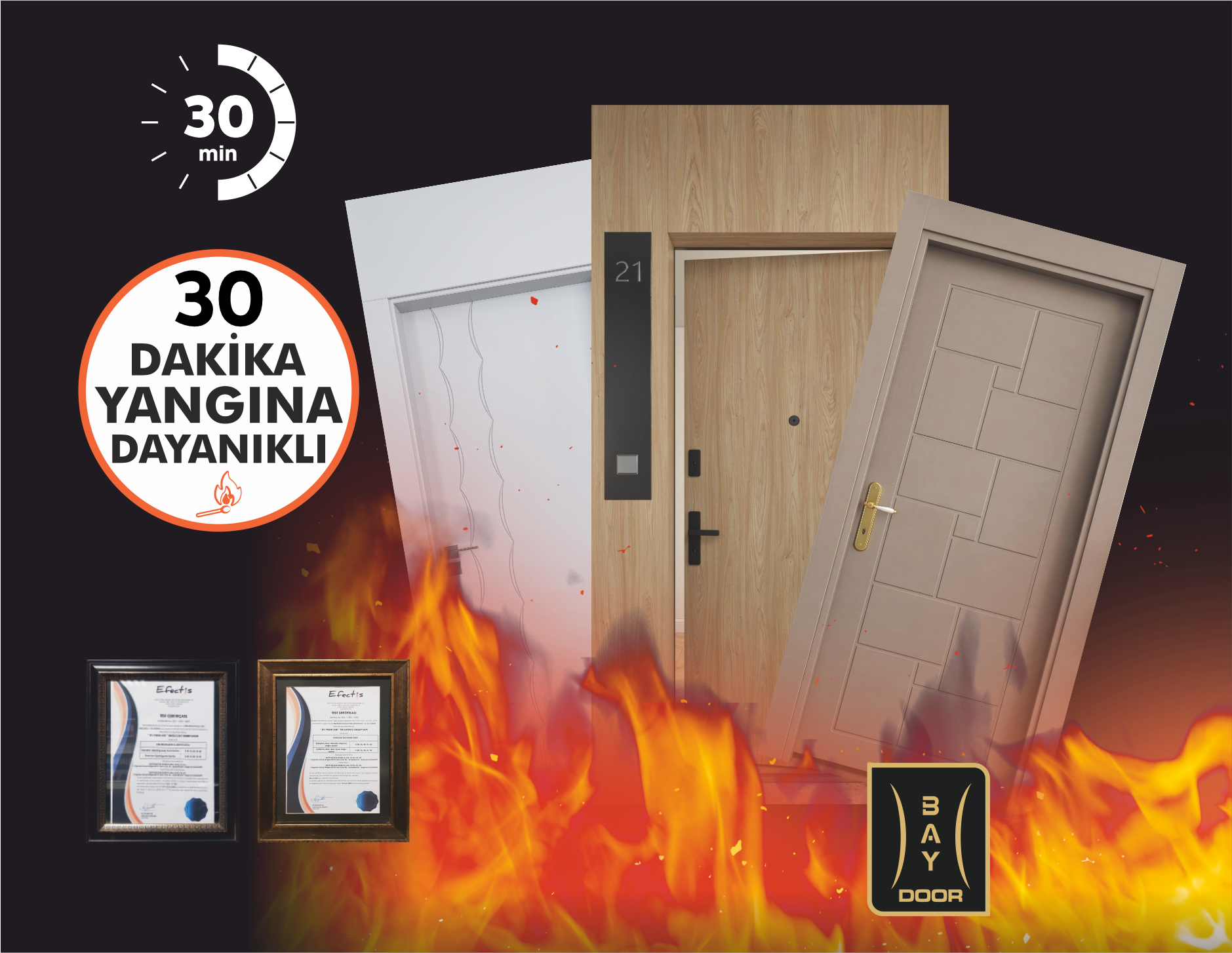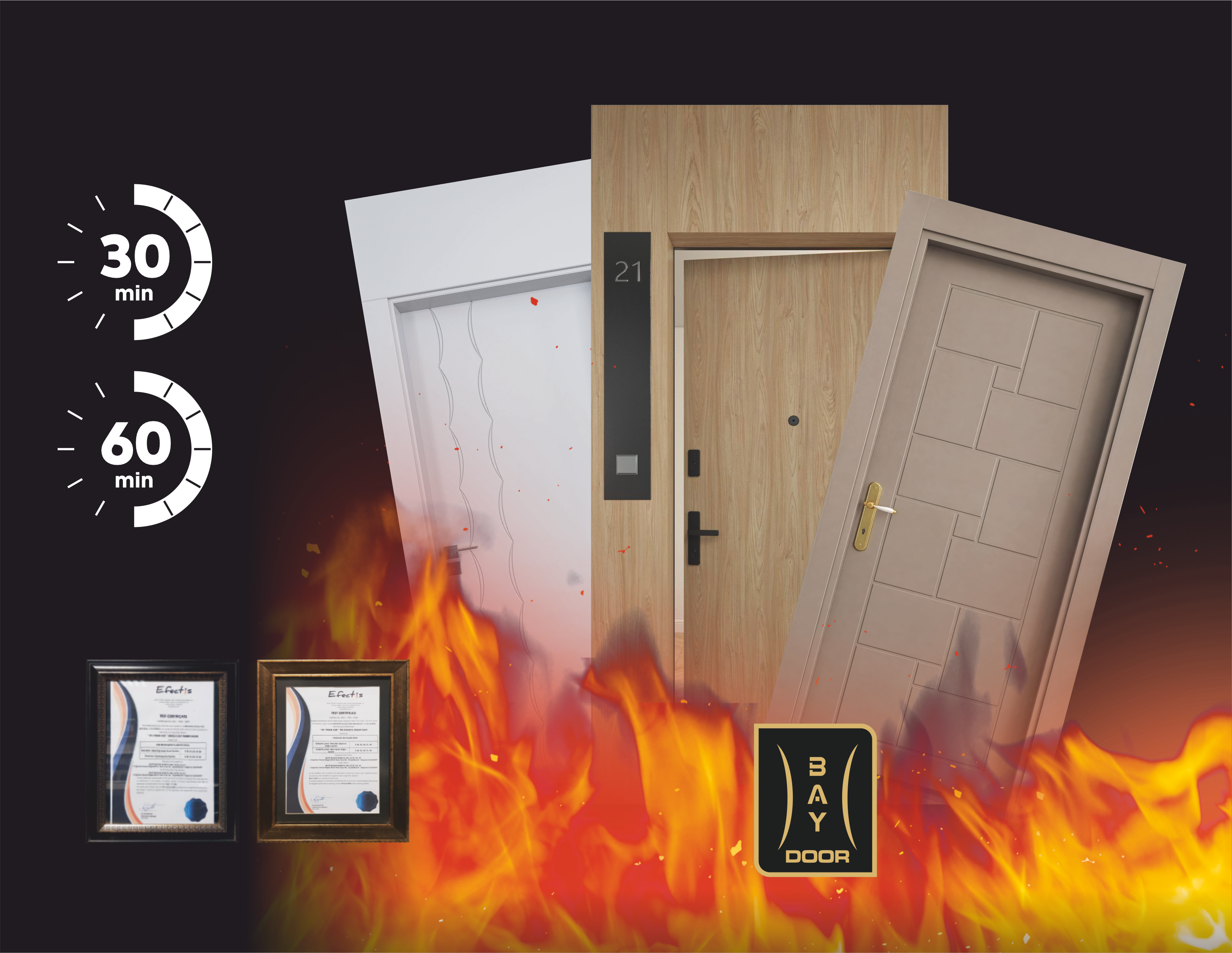 Baydoor yangına dayanıklı ahşap kapılar, uluslararası standartlara uygun testlerden geçerek sertifikalandırılmıştır.