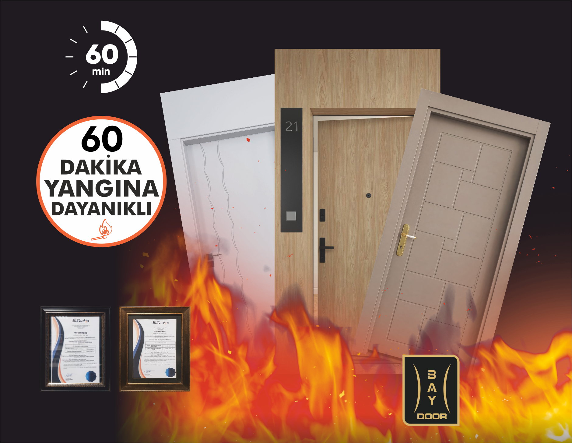 Yangına tam dayanıklı kapılar Baydoor’dan. Çünkü güvenlik detayda başlar, doğru kapıyla tamamlanır. Projeleriniz için bizimle iletişime geçin.
